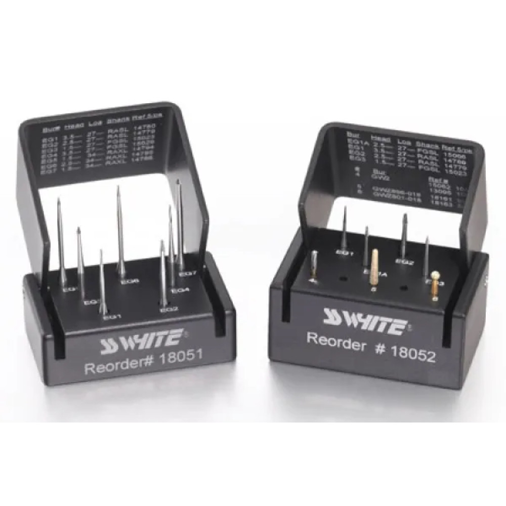 SS White® EndoGuide® Burs are a unique set of eight burs for non-surgical root canal treatment. The patented1 , conical shaped micro-diameter tip acts as a self-centering guide for straight-line access to canals, maximizing treatment efficiency and conserving healthy peri-cervical dentin. EndoGuide® Burs facilitate increased tactile sense of dentin and calcified canals, provide a polished dentin surface for easier visual identification of hidden canals and can reduce dependence on costly ultrasonic instrumentation.